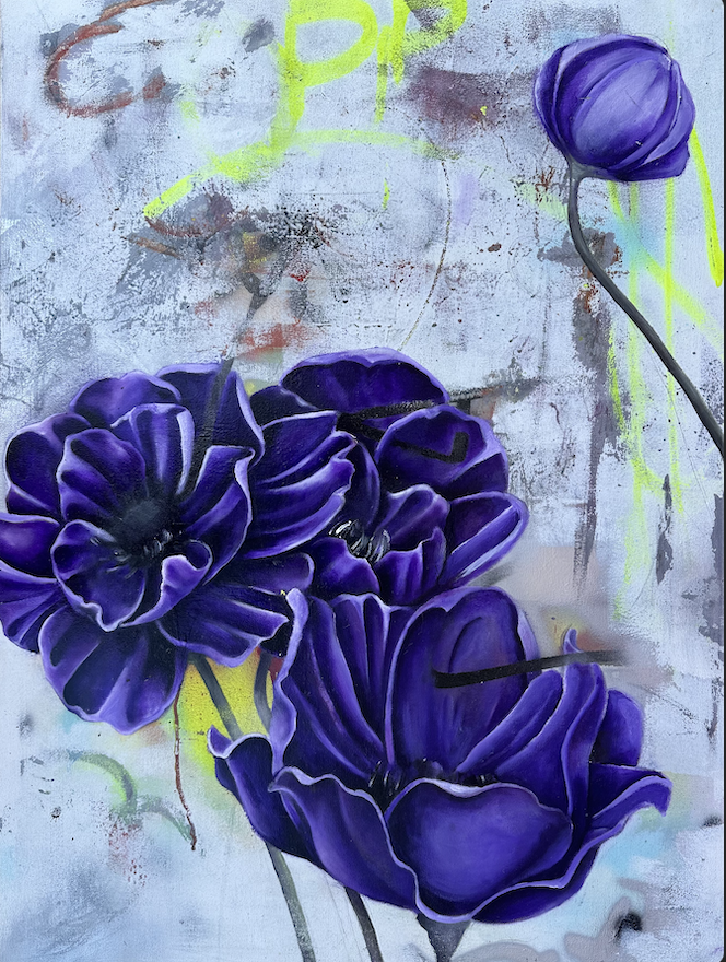 The myth says purple anemones appear wherever Aphrodite’s tears fall, and that story inspired this painting. The flowers come forward in rich violet tones, blooming against a rough, textured background as if they’re rising through whatever is behind them.