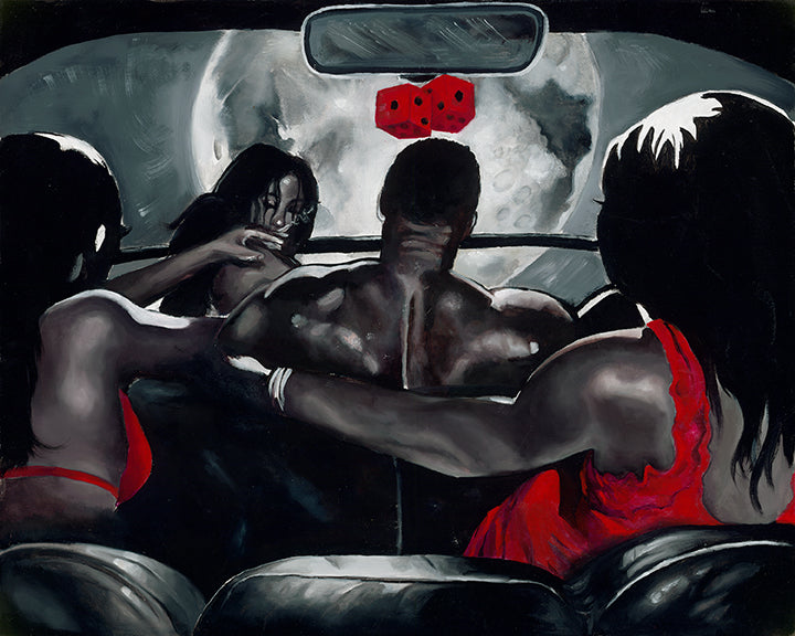 In the dim interior of a car under a swollen moon, a man sits surrounded by women, their hands reaching, clinging, claiming. The scene is seductive on the surface but unsettling beneath it a reminder that the people closest to you in the moment aren’t always there for you, just the version of you that the night creates. The fuzzy dice hanging from the mirror hint at risk, chance, and the dangerous game of letting the wrong energy steer you.